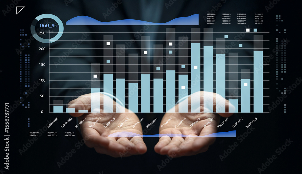 Data analytics in business growth with digital charts visualization, hands showing bar graphs and numerical statistics in modern analytics environment