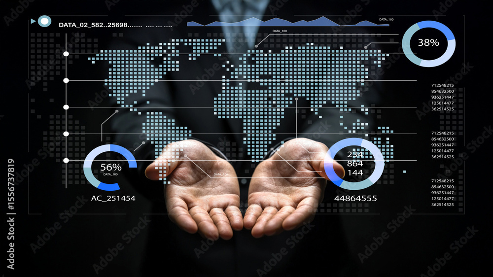 Hands Holding Digital World Map with Graphical Data Visualization and Statistical Charts Representing Global Connectivity and Analysis