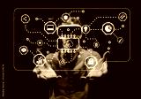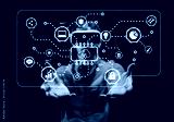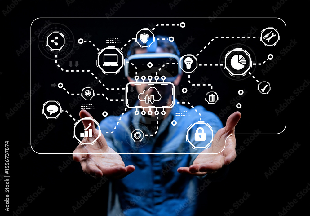 Hands of a Person in Virtual Reality Displaying Digital Icons Representing Technology, Security, Data, and Communication Concepts