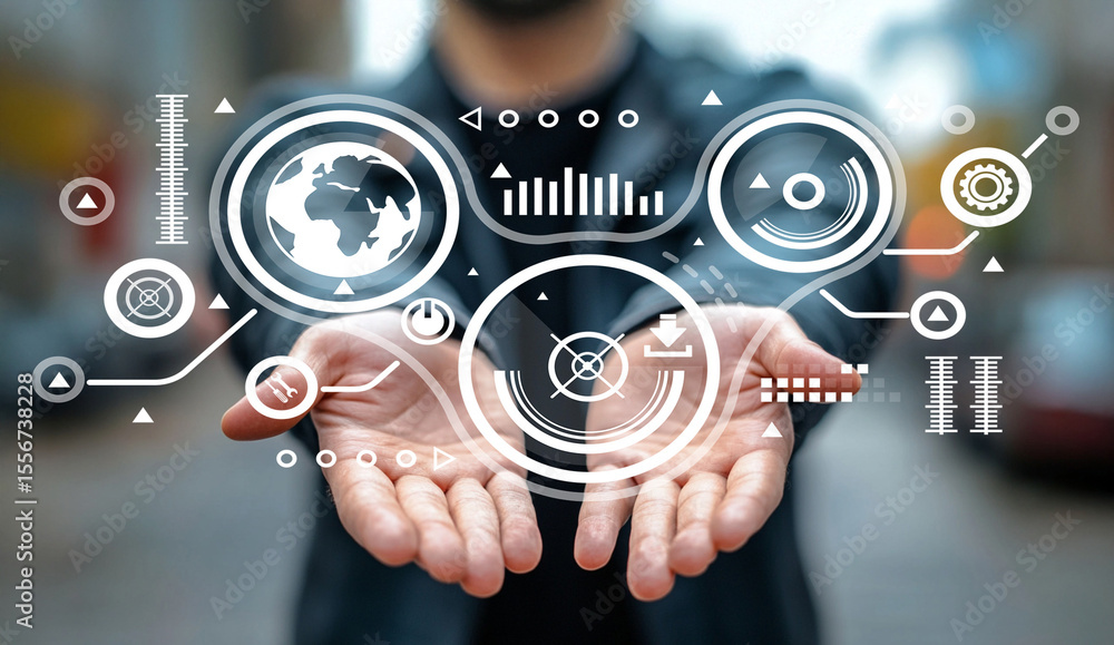 Hands Reaching Out with Futuristic Digital Interface Representing Data Analysis, Technology, Innovation, and Global Connectivity in Urban Environment