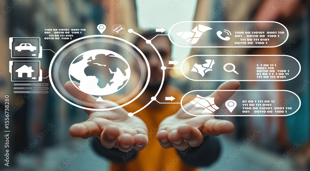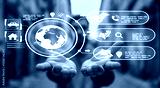 Digital Transformation Concept with Global Connectivity and Technology Interface Represented by Hands Reaching Out Towards Data Icons and Symbols