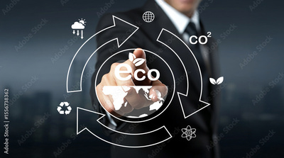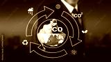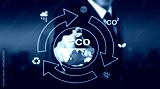 Conceptual representation of environmental sustainability with eco symbols, recycling icons, and a businessman interacting with digital graphics for green technology