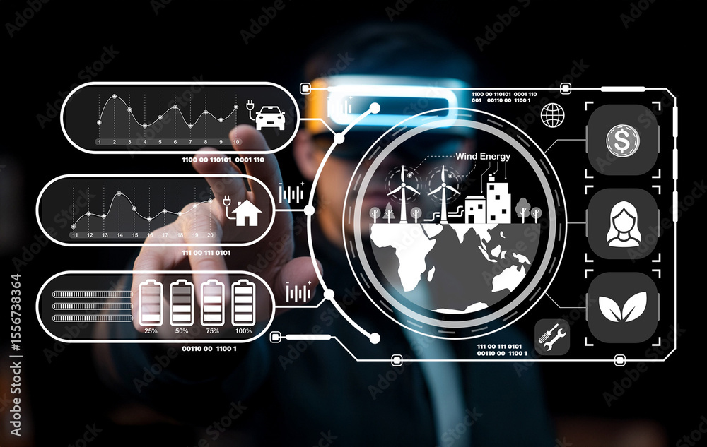 Futuristic interface showing renewable energy data and analytics with graphs, icons, and finger touch interaction, depicting wind energy and sustainability