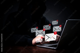 Hands typing computer laptop alert email Red warning icons, digital interface Digital Communication Phishing Attack Online Scam Cyber Threat. Concept hacker cybersecurity data theft.