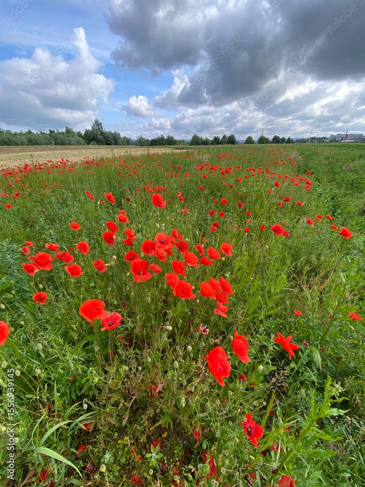 Polska wiec drzewa, maki, trawa , piękny krajobraz.