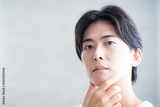若いハンサムな男性の美容やビューティーの透明感、爽やかスキンケアイメージ 顎に手を当てて考えるカメラ目線 アンニュイな表情