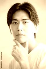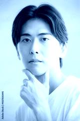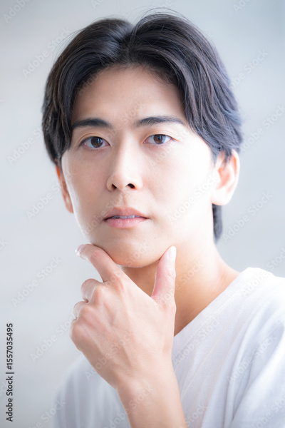 若いハンサムな男性の美容やビューティーの透明感、爽やかスキンケアイメージ 顎に手を当てて考えるカメラ目線 アンニュイな表情
