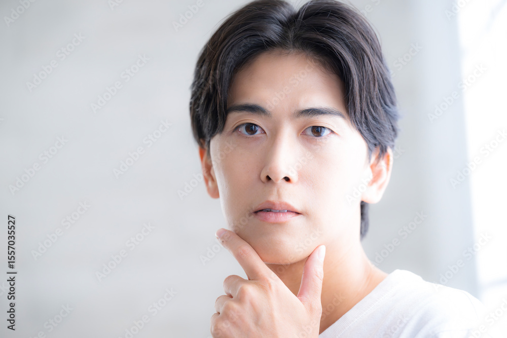 若いハンサムな男性の美容やビューティーの透明感、爽やかスキンケアイメージ 顎に手を当てて考えるカメラ目線 アンニュイな表情