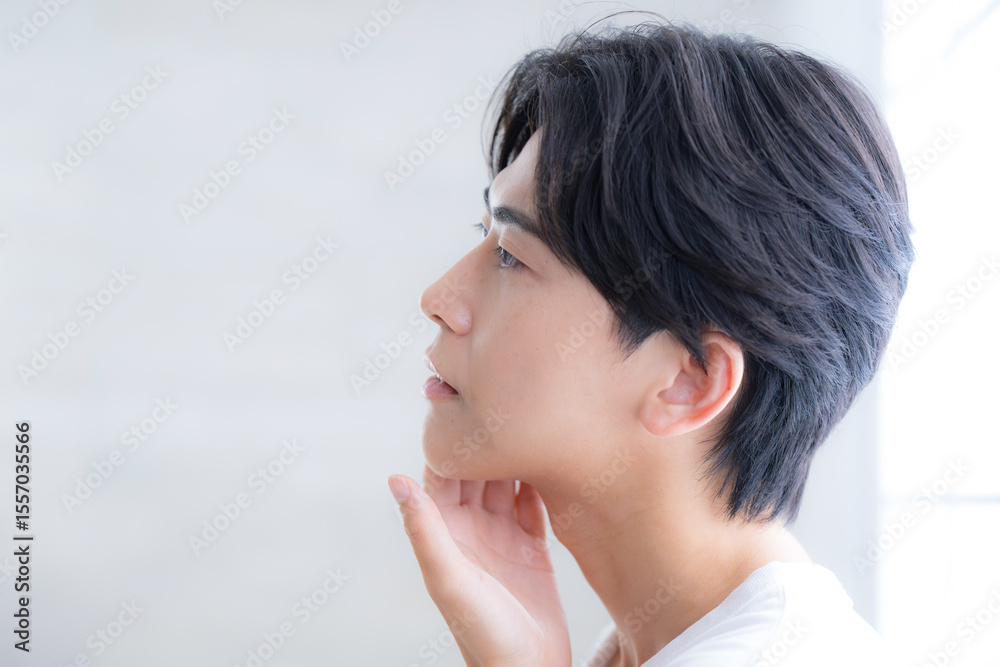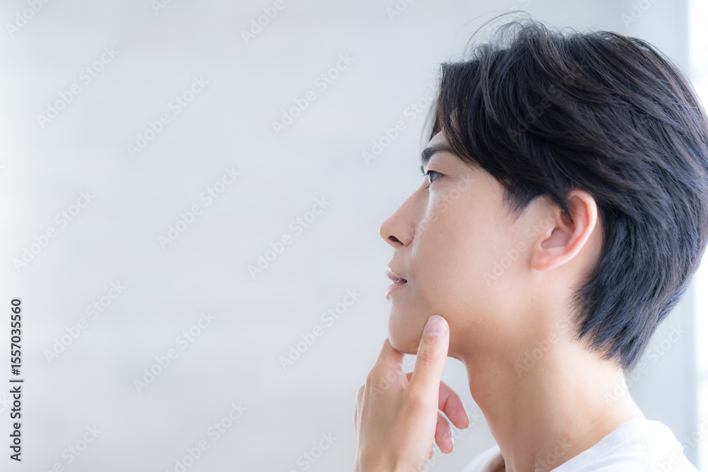 若いハンサムな男性の美容やビューティーの透明感、爽やかスキンケアイメージ 顎に手を当てて考えるカメラ目線 アンニュイな表情の横顔