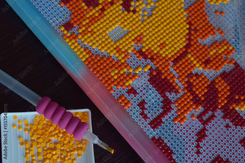 Detailed colorful diamond painting closeup showing vibrant beads and tools perfect for DIY hobby crafting handmade artistic projects and creative design concepts