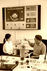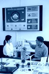 Business professionals collaborating on ESG strategies for significant carbon emission reduction and renewable energy integration in green business