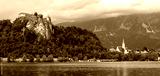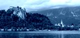 A panoramic view of the iconic landmarks surrounding Lake Bled, Slovenia. On the left, Bled Castle majestically perches atop a dramatic rocky cliff