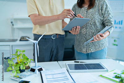 Corporate team analyzing energy strategy for long term sustainability and environmental conservation
