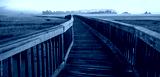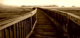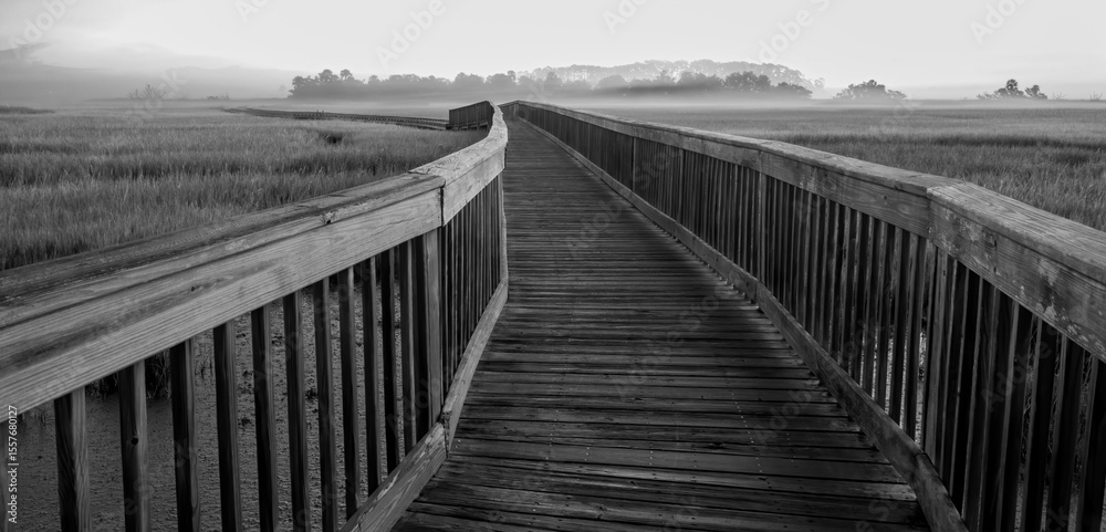 A black and white photo of a boardwalk over a salt marsh with mist hanging over the marsh grass and trees in the distance