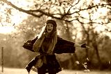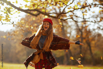 happy trendy woman in red hat with scarf and gloves rejoicing