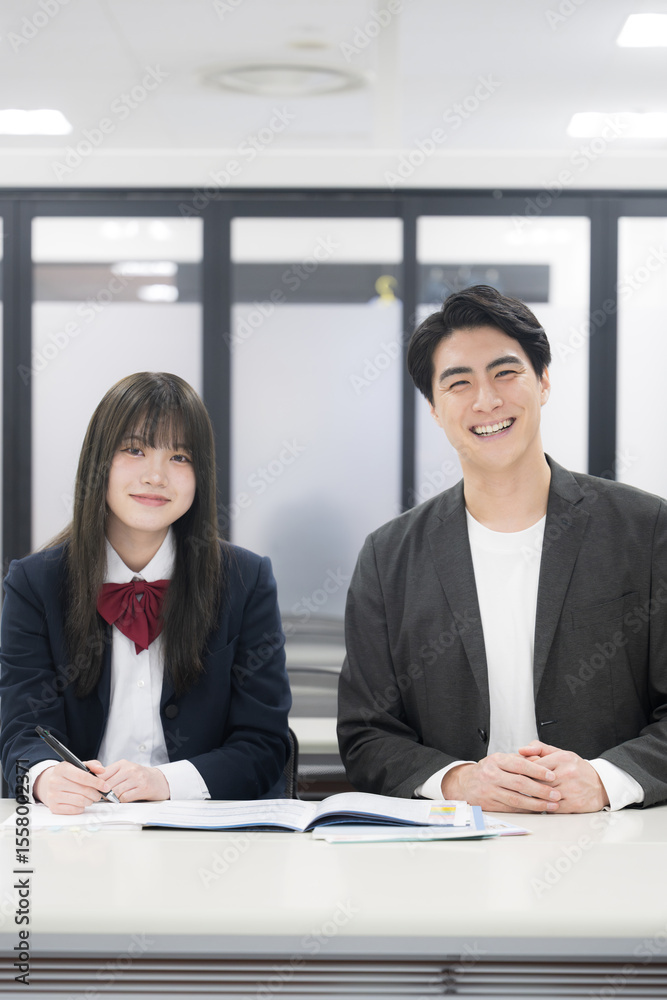 学生の面談や個別指導、進路指導の塾などのイメージの先生と生徒カメラ目線笑顔