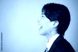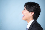 お~いと呼びかける叫ぶ男性のサラリーマンの横顔のクローズアップ 爽やかな水色背景 転職や求人などのイメージ