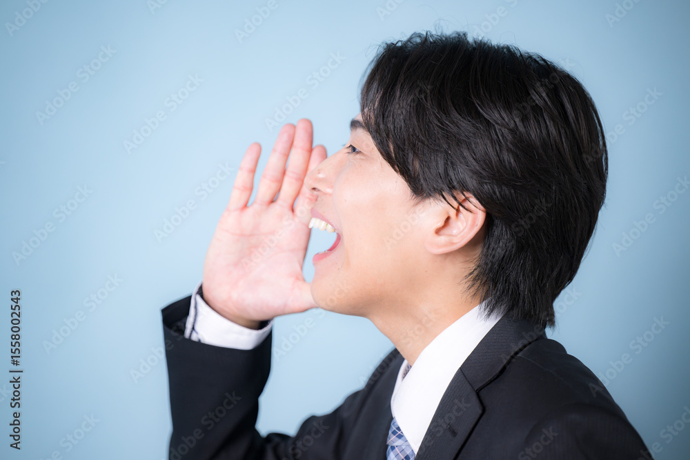 お~いと呼びかける叫ぶ男性のサラリーマンの横顔のクローズアップ 爽やかな水色背景 転職や求人などのイメージ