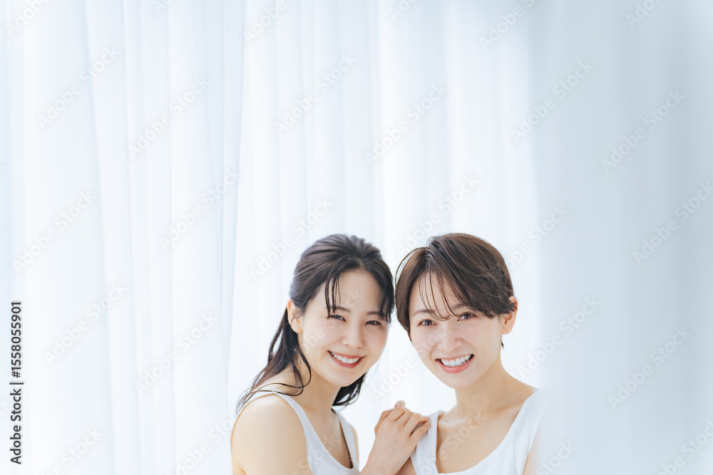 明るい部屋で寄り添う白いワンピースを着た二人の女性