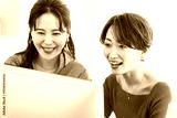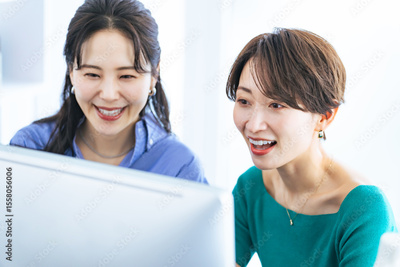 モダンなオフィスでPCモニターを見ながら会話する二人の女性