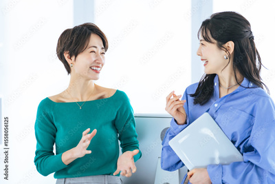 woman, office, conversation, teamwork, casual, stylish, positive, communication, human resources, japanese, asian, group, pair, colleague, smile, fun, happy, chat, work, consultation, business, busine