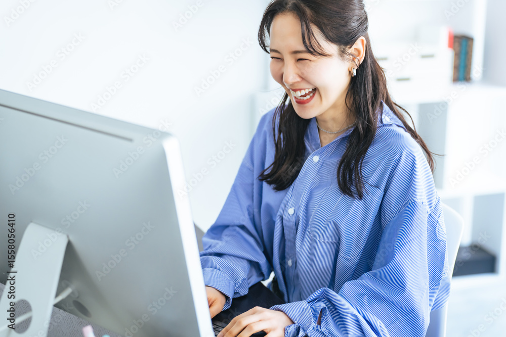 モダンなオフィスでPCモニターを見ながら作業する女性
