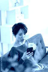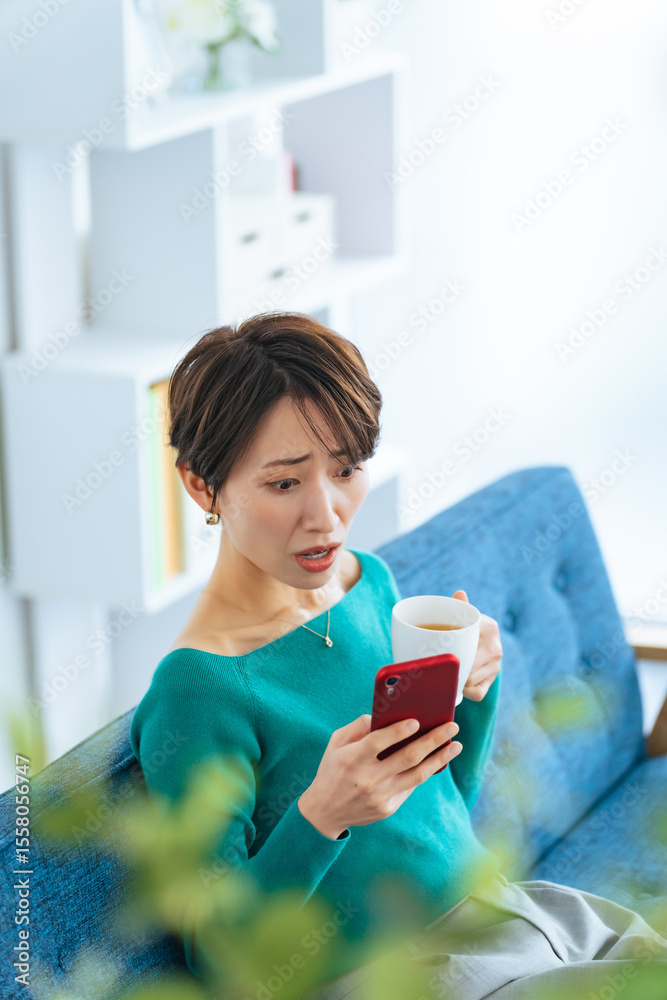 モダンなリビングでスマホを見て驚くミドルエイジ女性