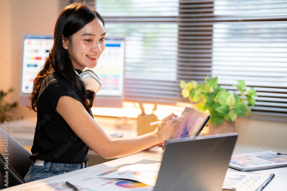 Asian woman designer drawing on tablet looking at laptop as sits with color chart at office's table.