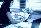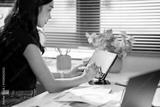 Asian woman designer drawing with stylus on tablet as sits with color chart at office working table.