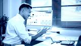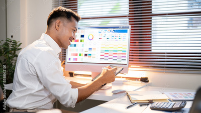 Happy asian man designer looking at color chart on tablet and sitting with computer on working table