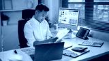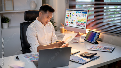 Asian man designer holding pen looking at color chart sitting with laptop and tablet at office table