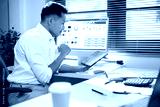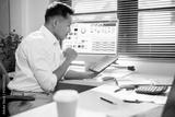 Asian man designer holding tablet looking at color chart and sitting with computer on working table.