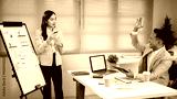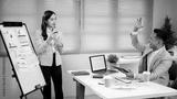 Businesswoman or office worker explaining a data on whiteboard and boss raising hand to ask question