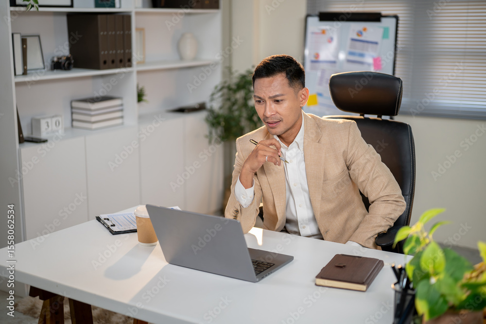 Asian businessman or office worker holding pen looking intently at laptop on office's working table.