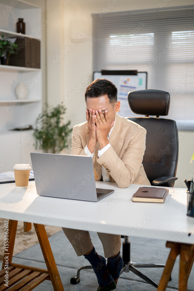 Asian businessman covering his face in disappointed or tired after looking at laptop on office table