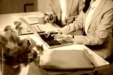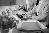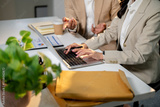 Close up of an asian businessman explaining while female coworker typing on laptop at office's table