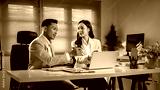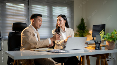 Asian businessman talking or explaining to female coworker discussing over laptop at office's table.
