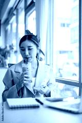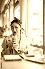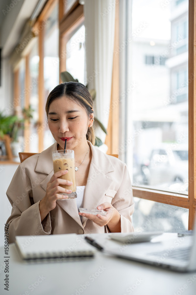 Asian woman holding glass coster drinking ice coffee with straw as looking at notebook on cafe table