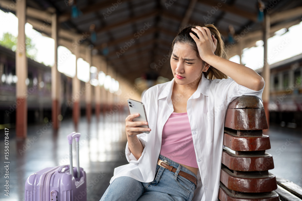 Asian woman holding phone looking stressed as sitting hand support head on wooden bench at train station.