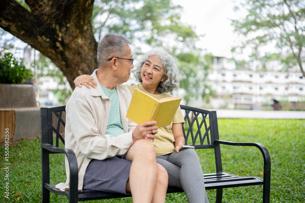 Old man holding book smiling at woman hugging his shoulder while reading together on bench in park.