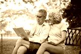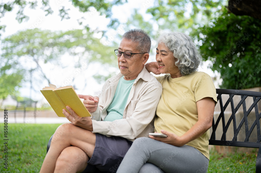 Glasses old man holding pointing at book to a woman while sitting reading together on bench in park.
