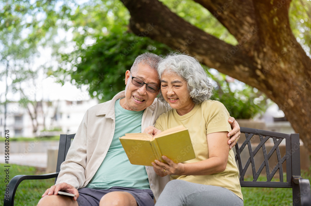 Glasses old man holding a woman's shoulder and reading book together while sitting on bench in park.