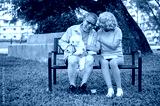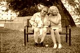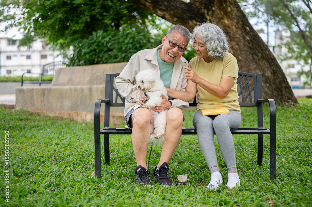 Glasses old man holding puppy and woman patting or playing with dog while sitting on bench in park.