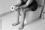 Woman sitting on the toilet bowl in the bathroom. She has stomach ache. Poor digestive system. Constipation. Diarrhea. Food poisoning. Health and medicine.