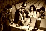 Group of multiethnic university students casually chatting in lecture hall,discussing notes and studying together with notebooks and textbooks on desks