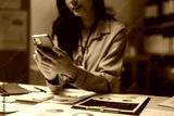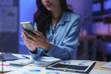 Businesswoman using smartphone and analyzing financial charts at night in office