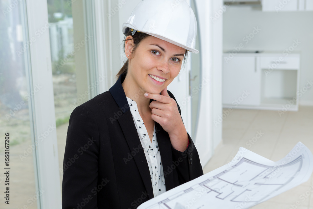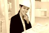 woman with hardhat on posing holding blueprint
