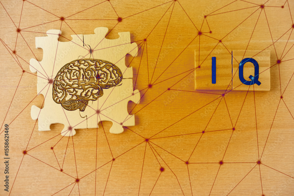silhouette brain, word IQ, wooden letters, intelligence quotient on wooden background, quantitative science indicator expressing success, concept idea, level mind, intellectual achievements testing
