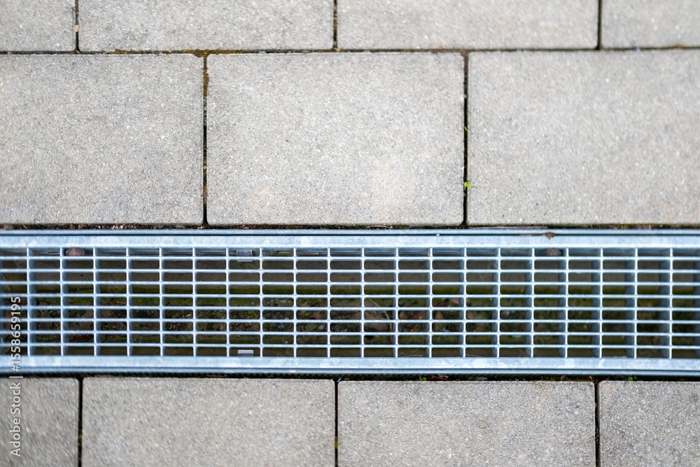 modern drainage grate integrated into a patterned concrete sidewalk, Essential urban infrastructure for efficient stormwater management