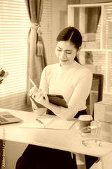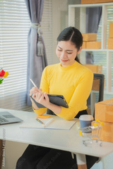 Asian woman delivery concept, freelance, online shopping, working on laptop with parcel box at home, online SME business, vertical photo.